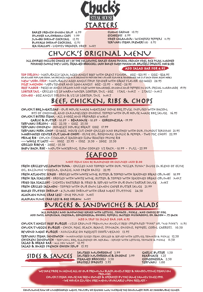 And then there’s the Certified Angus Beef ® brand Prime-so exclusive, only the top 3% of beef qualifies. For maximum flavor and your complete satisfaction, we age each of our Certified Angus Beef ® brand Prime offerings for 28 days. Picture a hunting lodge on the beach and you’ll get a pretty good read on Chuck’s. Deer antlers and exotic-game trophy heads make up the décor, and a large fireplace gives the dining area a cozy, farmhouse charm. The back patio overlooks the Intracoastal Waterway and is a good spot for those who prefer not to look at taxidermy while they eat.